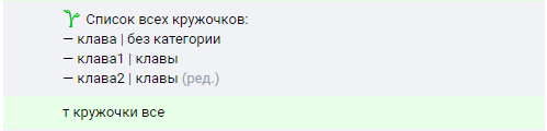 Если не указывать категорию — будет выведен список категорий, если указать категорию «все», будут отображены все Кружочки.