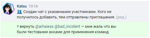 При применении в личных сообщениях эта команда позволяет создать чат с участниками упомянутыми сообщения. Стоит упомянуть, что достаточно только упоминания, и сообщение может и содержать сторонний текст.