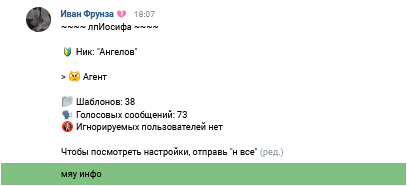 Показывает ваш ник, статус, количество шаблонов, голосовых и количество игнорируемых пользователь